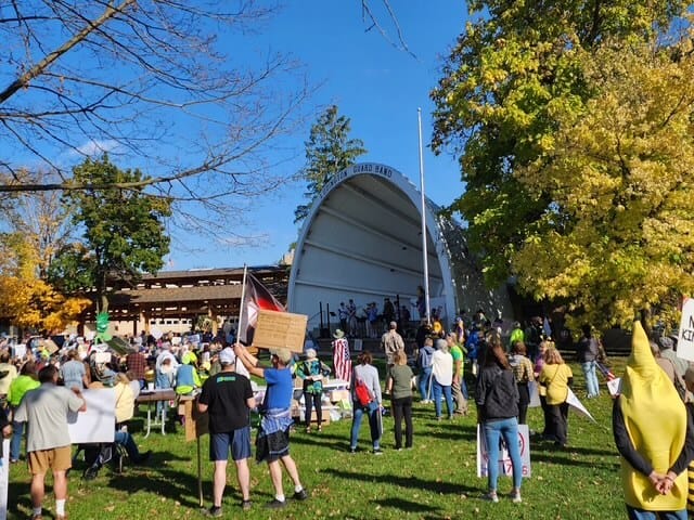 A “No Kings Rally” was held Sat Oct 18 with an estimated 1000+ in attendance at Wilson Park. Following a program in the bandshell, the event continued with a march through downtown led by a band. An estimated 2700 rallies were held across the country. Photo: submitted.