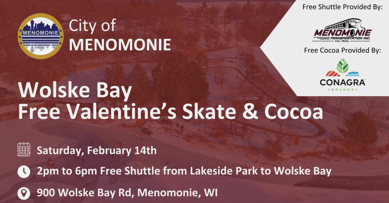 The event takes place on Saturday, February 14 from 2 to 6 pm and is free and open to all ages. Whether you stay for the full afternoon or stop by for a quick skate, this is a relaxed and festive way to spend Valentine’s Day enjoying winter in Menomonie.