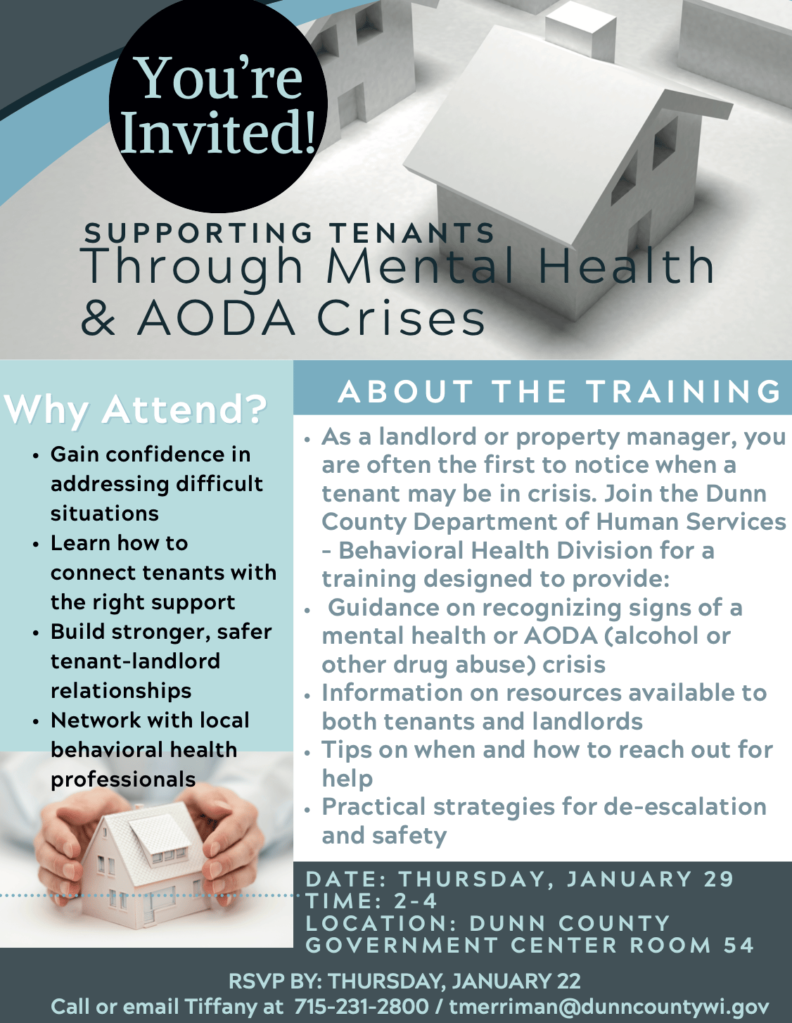 This training grew out of conversations between a local landlord and Dunn County Human Services. The landlord shared that property owners are often placed in the role of “first responders” when tenants experience mental health or alcohol and other drug use (AODA) crises, and that many landlords are looking for clear guidance and local resources to respond appropriately. Designed for landlords and property managers, the training will focus on recognizing signs of crisis, de-escalation strategies, when and how to seek help, and how to connect tenants with local supports.