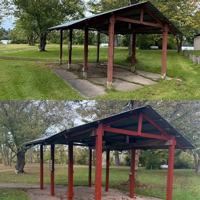 Typical work: Pressure washing pavilions and picnic tables; Treating concrete surfaces; Trimming brush and overgrowth; Repainting structures; Replacing rusted grills